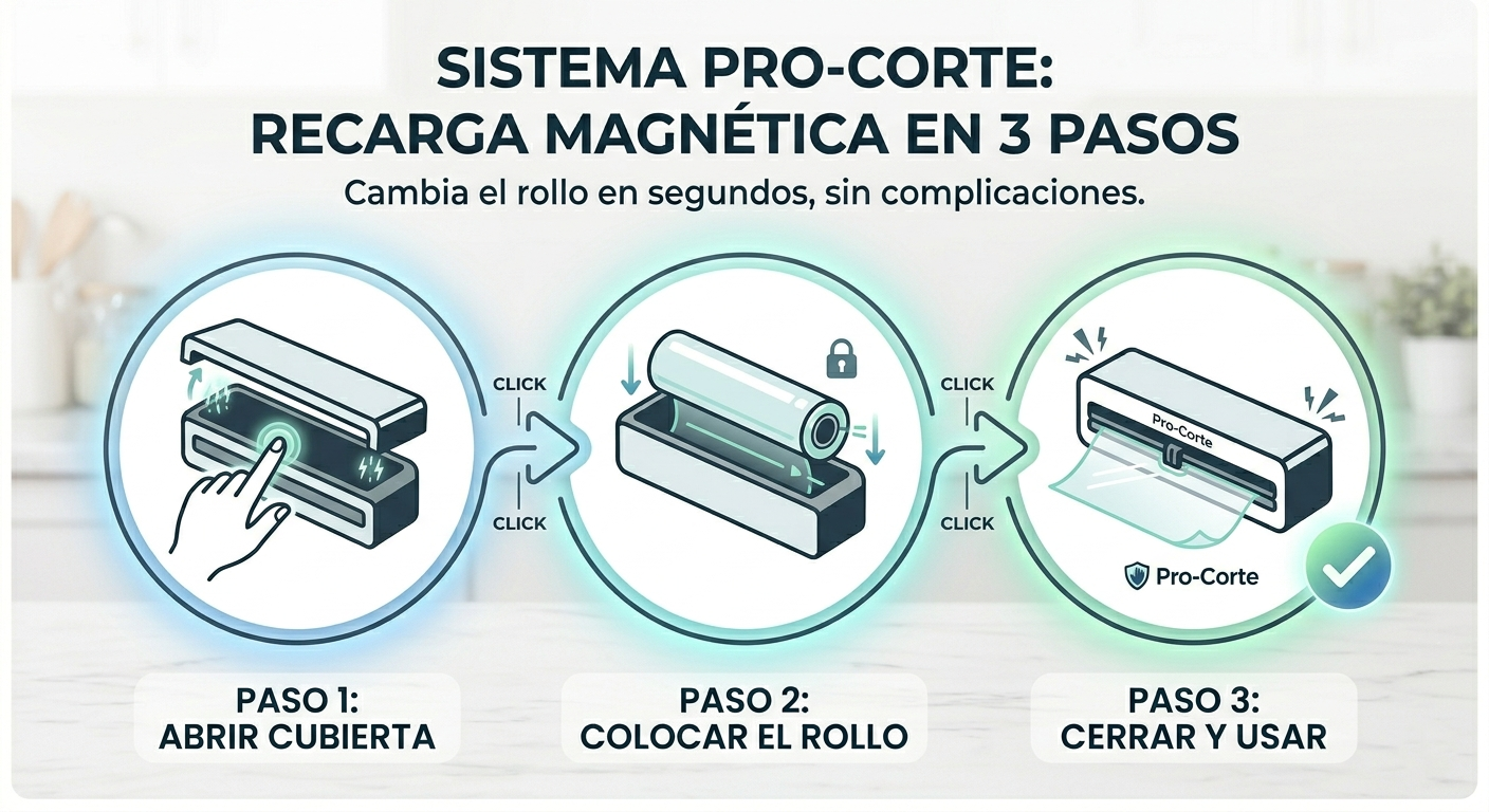 Deja de desperdiciar dinero y tiempo con rollos que se enredan; descubre la forma profesional de sellar tus alimentos en un segundo.