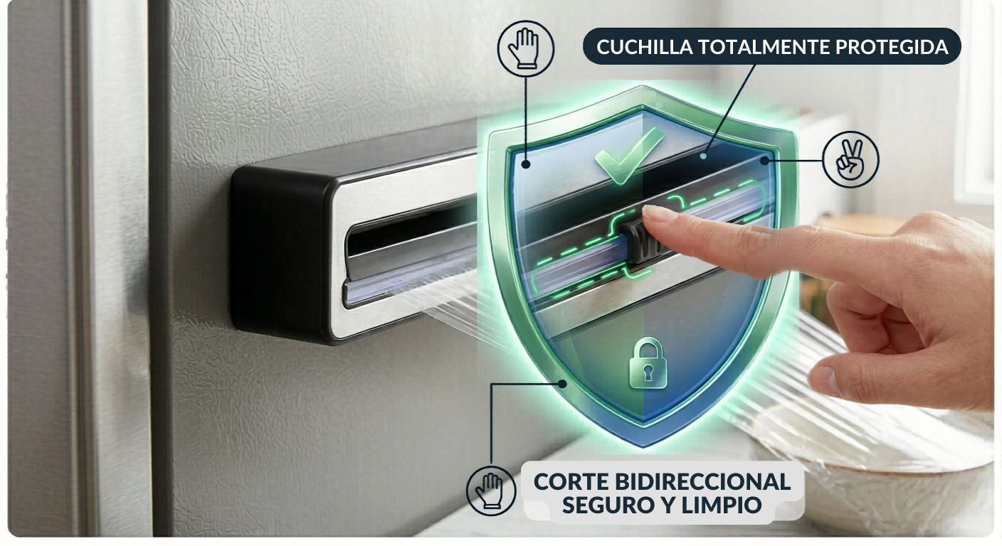 Diseñamos una cuchilla invisible que solo corta el plástico, nunca tu piel. Puedes dejar que los niños ayuden en la cocina con total tranquilidad; el sistema oculto elimina cualquier riesgo de accidentes o cortes accidentales.